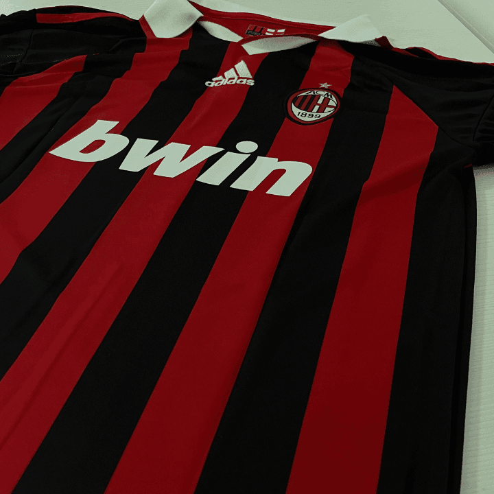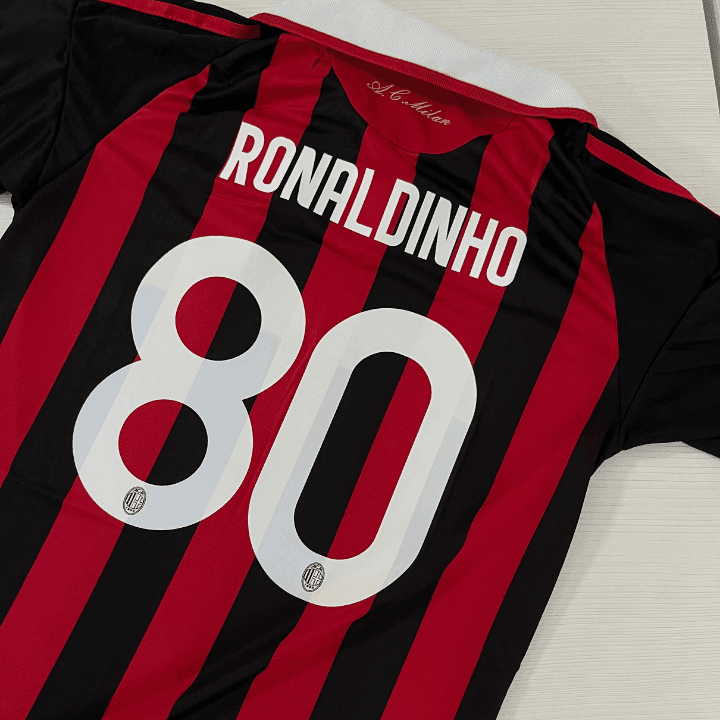 Camiseta titular Milan 08/09 con cuello, dorsal #80 de Ronaldinho, escudo bordado y detalles en vinilo y bordados.
